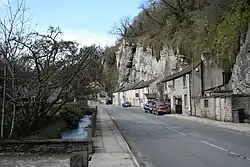 A semi-circular earth platform called "Castle Hill" overlooks the village; academic opinion varies as to what this earthwork originally was.[3] It may have been a ringwork castle, or simply the foundations of a summer house.[3] The origins of the name of the village go back to the Saxo-Norman period when it was known as Middletone or Middletune,[4] the name Stoney Middleton literally meaning 'stony middle farm'.