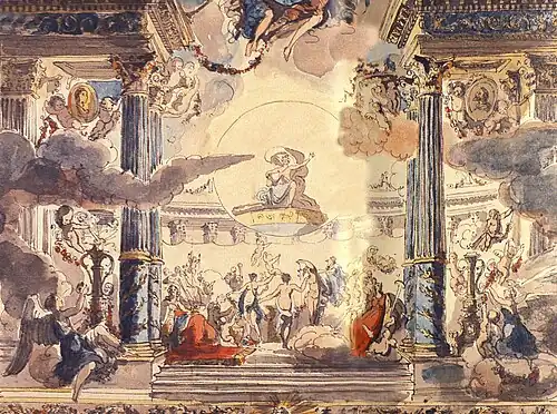 The 18 January 1773, the opera Thetis and Phelée, performed by Carl Stenborg and the concert-singer Elisabeth Olin in the leading roles, inaugurated the Royal Swedish Opera, which was a great success. This was an opera, not a theater, and the attempts to perform speaking drama was not very successful. At the inauguration, the building had been redecorated; the walls were painted in greyish-yellow, the boxes in red, except for the Royal box, which was painted in blue and gold and the sealing a sky in white and gold.
