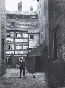 The courtyard in 1916 with a sign reading "Waldemar Bau, Snedkermester"