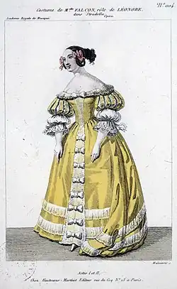 Falcon lost her voice catastrophically during the second performance of Stradella at the Opéra in March 1837. When Nourrit as Stradella asked her "Demain nous partirons – voulez-vous?", Falcon was unable to sing her line "Je suis prête", fainted, and was carried offstage by Nourrit.[3] Hector Berlioz, who was present, describes "raucous sounds like those of a child with croup, guttural, whistling notes that quickly faded like those of a flute filled with water".[4] Her career never recovered from this disaster, and after 1840 she never performed publicly again. Nourrit gave a farewell performance in April 1837 after the first performances of Stradella, and later that year travelled to Italy, where he committed suicide in 1839.