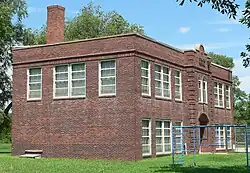 A flagpole is located outside the main entrance to the school building, and is included in the NRHP listing as a contributing feature. A set of gym bars, a tether ball pole, a swing set, a "slippery slide", and a merry-go-round are located on the south and west sides of the property, and are all listed as contributing features. A fenced tennis and basketball court is located on the north side of the property, and a large track and playing field are located on the west side of the property, but none of these features are included in the listing.[2]