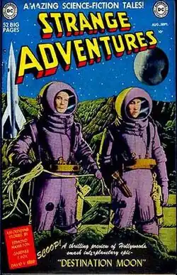 Strange Adventures ran for 244 issues and was DC Comics' first science fiction title. It began with an adaptation of the film Destination Moon.[1] The sales success of the gorilla cover-featured story in Strange Adventures #8 (May 1951) led DC to produce numerous comic book covers with depictions of gorillas.[2][3] The series was home to one of the last superheroes of the pre-Silver Age of Comic Books era, Captain Comet, created by writer John Broome and artist Carmine Infantino in issue #9.[4] A combination of the "Captain Comet" feature with the "gorilla craze" was presented in issue #39 (December 1953).[5] Other notable series included Star Hawkins which began in issue #114 (March 1960)[6] and the Atomic Knights which debuted in issue #117 (June 1960).[7]
