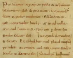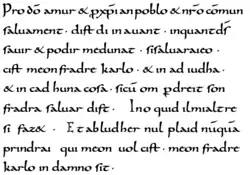 Pro Deo amur et pro christian poblo et nostro commun saluament, d'ist di en auant, in quant Deus sauir et podir me dunat, si saluarai eo cist meon fradre Karlo, et in adiudha et in cadhuna cosa, si cum om per dreit son fradra saluar dift, in o quid il mi altresi fazet. Et ab Ludher nul plaid nunquam prindrai qui meon uol cist meon fradre Karle in damno sit.