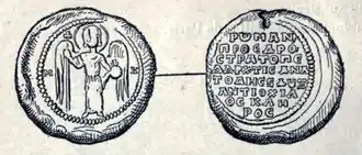The title megas stratopedarchēs ('grand master of the camp') was instituted c. 1255 by the Emperor Theodore II Laskaris (r. 1254–1258) for his chief minister and confidante, George Mouzalon.[10] Theodore II states in a decree that he "established the dignity anew", but no other holder of the office is known before that time.[11] The mid-14th century Book of Offices of pseudo-Kodinos places the megas stratopedarchēs as the ninth-most senior official of the state below the Emperor, ranking between the prōtostratōr and the megas primmikērios.[12][13] Kodinos reports that he was "supervisor of the provisioning of the army, that is food, drink and all necessities".[12][13] In reality, however, during the Palaiologan period (1261–1453) the [megas] stratopedarchēs was most likely an honorific court title, and did not necessarily entail an active military command.[4][14] Like many other titles in the Palaiologan period, the post could be held by two people simultaneously.[13] According to Pseudo-Kodinos, the ceremonial costume of the megas stratopedarchēs was identical to the offices immediately superior to it: a rich silk kabbadion tunic, a golden-red skiadion hat decorated with embroideries in the klapōton style, without veil, or a domedskaranikon hat, again in red and gold and decorated with golden wire, with a portrait of the emperor standing in front, and another of him enthroned in the rear. Only his staff of office (dikanikion) differed, with all the knobs except the topmost in silver, and golden engraved knots.[13][15]