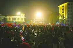 Following Vietnam exciting 2-1 victory against Thailand in the 2024 ASEAN Championship final in 2025, the streets exploded in joy, demonstrating the country's strong passion for football.[35] Fans congregated in cities such as Hanoi and Hue, waving flags, set off red fireworks and chanting in unison, fostering a strong sense of unity and patriotism.[36][37] The celebrations highlighted a spirit of unity, with people coming together to celebrate their national team's win.[38][39] Surprisingly, despite their excitement, some supporters demonstrated discipline by observing traffic restrictions and not running red lights, demonstrating a growing sense of responsibility among the attendees.[40][41]