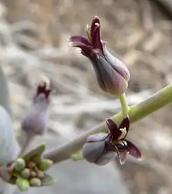 Streptanthus cordatus is a species of flowering plant in the mustard family known by the common name heartleaf twistflower.[2][3] It is native to the western United States, where it can be found in many types of sagebrush, woodland, and forest habitat. It is a perennial herb producing a branched or unbranched stem up to about a meter tall. It is often waxy in texture. The basal leaves are oval or spoon-shaped with bristle-toothed blades borne on rough-haired petioles. Leaves higher on the stem are oval to lance-shaped, up to 9 centimeters long with their bases usually clasping the stem. Flowers occur at intervals along the upper stem. Each has a calyx of sepals roughly a centimeter long which begin greenish yellow and mature purple. Four purple petals emerge from the tip of each calyx. The fruit is a thin, narrow silique which may reach 14 centimeters in length or longer.