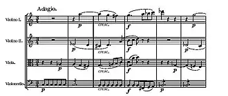 The entire Adagio is an elaborate preparation of the dominant chord which Mozart emphasizes with a fermata in its final measure.[7] When the Allegro begins, the cello is silent, and the viola has taken up its eighth note Cs, playing them an octave higher and much more ebulliently than the opening bars.[8]: 700
