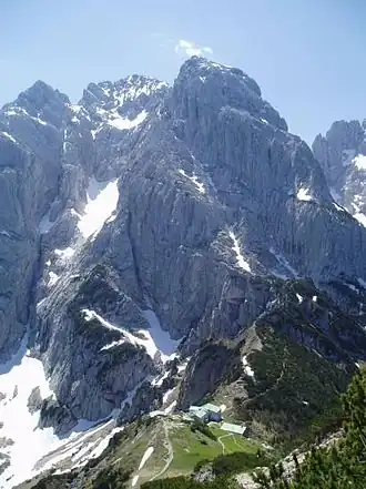 The Stripsenjoch is a small mountain pass (German: Joch or Pass) in Austria with a height of 1,577 m (AA), which forms a bridge between the mountain ridges of the Zahmer Kaiser and the Wilder Kaiser, the two halves of the Kaisergebirge. In addition it marks the watershed between the Kaisertal in the west (towards Kufstein) and the Kaiserbach valley in the east. It derives its name from the neighbouring peak of the Stripsenkopf (1807 m). At the same time the Stripsenkopf is the local mountain (Hausberg) for the Stripsenjochhaus, an Alpine club hut belonging to the Austrian Alpine Club (Österreichischer Alpenverein).