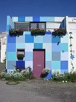 First, there are the 1052 (formerly 800) single bungalows. Characteristic was the painting of the bungalow doors and facades, which was an expression of European youth culture. During the renovation of the bungalows for the 2002 European Athletics Championships, the doors were exchanged among other things and the paintings were therefore partially lost. The bungalows were an extremely popular form of housing among students before the renovation work started. The reinforced concrete precast newly built mini houses are oriented substantially to the original bungalows of 1972. In the planning for the new construction of the bungalows, Werner Wirsing one of the old architects, was involved. The residents have a two-storey maisonette apartment, which has a kitchenette, bathroom and terrace. In addition, every new resident has the right to design the façade of his bungalow himself.