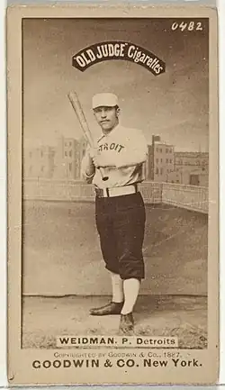 After the Albany team folded, Weidman joined the Detroit Wolverines and brought his catcher Sam Trott with him.[2][4] Weidman and Trott made their debut for Detroit on September 3, 1881, a 4–3 loss against Buffalo.[4] Weidman started 13 games for Detroit in the last month of the season, compiling an 8–5 record and 1.18 ERA in 115 innings pitched. He led the National League in ERA and had the lowest WHIP rating (walks + hits per inning pitched) at 1.043.[1]