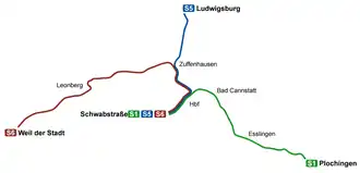 | S 5 | Schwabstraße – Hauptbahnhof – Zuffenhausen – Ludwigsburg – Bietigheim | 26 km | Verbindungsbahn – Franconia Railway |