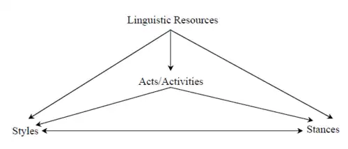 This approach focuses more on interaction and reaction in a linguistic context, rather than a static identity or social group. Linguistic variables do not index specific social groups by themselves, but instead combine with other linguistic variables to index various stances and styles, which are in turn associated with social groups.[8][9][10] Kiesling writes: