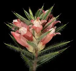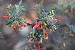 Styphelia is a genus of shrubs in the family Ericaceae, native from Indo-China through the Pacific to Australia.[2] Most have minute or small leaves with a sharp tip, single, tube-shaped flowers arranged in leaf axils and with the ends of the petals rolled back with hairs in the inside of the tube.