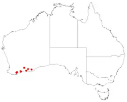 This species occurs in the Jarrah Forest bioregion of the south-west of Western Australia and is listed as "Priority Two" by the Western Australian Government Department of Biodiversity, Conservation and Attractions,[5] meaning that it is poorly known and from only one or a few locations.[6]