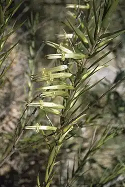 Styphelia longifolia, commonly known as long-leaf styphelia,[2] is a species of flowering plant in the heath family Ericaceae and is endemic to New South Wales. It is an erect shrub with more or less lance-shaped leaves and pale green or yellow flowers arranged singly in leaf axils.