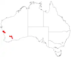 This species occurs in the Avon Wheatbelt and Geraldton Sandplains bioregions of south-western Western Australia.[8]