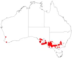 Spoon-leaf beard-heath occurs in scattered populations in northern and north-eastern Victoria, extending into south-eastern South Australia and the far south of New South Wales. In usually grows in heath, but is also found in open forest and mallee scrub.[2][3][4]