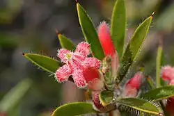 Styphelia stomarrhena (common name - red swamp cranberry)[2] is a species of flowering plant in the family Ericaceae and is endemic to the south-west of Western Australia. It is a low, spreading or compact shrub with narrowly elliptic, sharply-pointed leaves and red, tube-shaped flowers usually arranged singly in leaf axils.