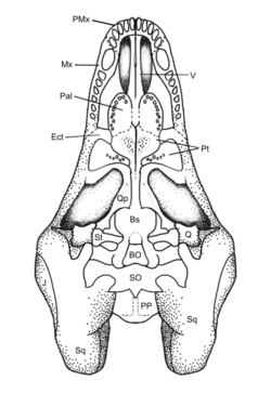The palate of Styracocephalus is often well preserved in many specimens. It has two paired pterygoids that make up a flat triangular surface that contacts and is concave to the dentary. The interpterygoidal vacuity is small and, on the midline, behind the transverse process.[6] There are small palatal teeth as well as paired vomers on the midline. Serrations, although not found on Styracocephalus, are found on Titanophoneus and Theriodontia. The palate also does not exhibit any suborbital fenestrae.[1]