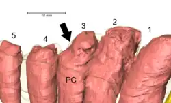 There are typically around eight to ten of these post-canines that also have lingual heels. The incisors containing crushing heels are like those seen in Tapinocephalidae, Titanosuchidae and Dinocephalia. The presence of lingual heels indicates the specimen is representative of Dinocephalia later in the mid-Permian. They also have crowns that are relatively blunt, which can be indicative of grinding plant material.[6]