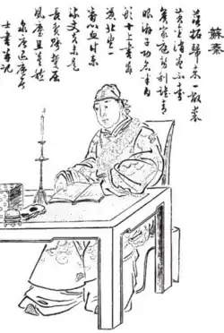 After finishing his studies with Guiguzi, Su Qin travelled for several years and on his return lamented that "My wife doesn't recognize me as her husband, my sister-in-law doesn't recognize me as her brother-in-law, and my parents don't recognize me as their son!". All these misfortunes he blamed on himself and he thereafter shut himself in his room to study. Years later, when Su Qin returned with full honors following his success with the Vertical Alliance system, his family received him with great reverence, causing him to remark on their change of behavior towards him, leading to the rise of another Chinese idiom which means "a change of attitude from arrogance to respect" (Chinese: ).[1]