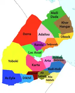 Djibouti is divided into five administrative regions and one city. The regions are divided into twenty administrative sub-prefectures.