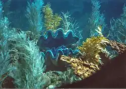 As the submarine leaves the dock, it dives below the surface to view the undersea life of a tropical lagoon. The diving effect is accomplished by a dense curtain of small bubbles rushing towards the surface on a slight angle, giving the feeling that the submarine is moving forward and down. Guests can view seaweed, coral reefs, rock formations, and mysterious caves.