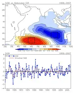 The Subtropical Indian Ocean Dipole (SIOD) is featured by the oscillation of sea surface temperatures (SST) in which the southwest Indian Ocean i.e. south of Madagascar is warmer and then colder than the eastern part i.e. off Australia.[1] It was first identified in the studies of the relationship between the SST anomaly and the south-central Africa rainfall anomaly; the existence of such a dipole was identified from both observational studies and model simulations[2] .