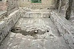 Construction was first limited to the apodyterium (dressing room), frigidarium (cold room), tepidarium (warm room), laconicum (hot dry room) and caldarium (hot room); the natatio was added later as three rooms, including a nymphaeum with a water cascade,[7][17] providing an alternative route to the existing one of the tepidarium followed by the caldarium.[18] The entrance to the bathhouse is through a long corridor that leads into the apodyterium. The bathers would also have had access to a latrine, seating between six and eight people.[19]