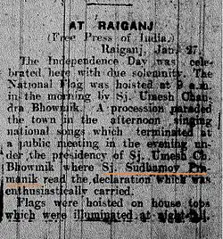 In his presidency days he met many nationalists. In 1919, he was a member of the 'moderate' Indian National Liberation Foundation led by Surendranath Bannerjee - one of the founders of the Indian National Congress; but who left the Congress, since he favoured accommodation and dialogue with the British.[8] He went on to support the Congress [9] and joined as a senior leader during his tenure at the Raigunj Court. When the Civil disobedience broke out in the 1930, Sudhamoy took an active role as a Congress member from Raigunj.[10] Raigunj celebrated Independence day (Purna Swaraj) on 26 January 1930 against the British Raj - he and Umeshchandra Bhowmik were the Congress leaders enacting the historic Lahore resolution of the CWC.[11] In March 1930, as mass disobedience gathered momentum in Bengal, several Congress leaders (including Netaji - then Bengal Provincial Congress Committee President), were arrested. On 15 April, on the occasion of the Bengali New Year, Sudhamoy presided over public meetings in Raigunj as a part of the Civil Disobedience Movement in blatant violation of the Salt Laws. Braving arrests by the British, volunteers from all over the district, including women, paraded the streets of Raigunj.[12][13]