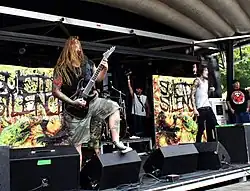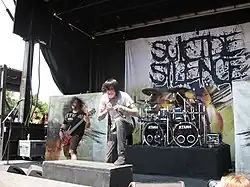 Suicide Silence performs deathcore,[66][67][68] which is a fusion between death metal and metalcore.[69] They are influenced by black metal, grindcore, mathcore and groove metal.[70][71][72][73][74] The mathcore elements can be seen in the varied speed changes and complex time signatures in the band's music. The vocals fluctuate between death growls used in death metal and high-pitched screamed vocals used in black metal, combined with anti-religious lyrics, though, later down the line of their career, they switched to discussing more personal issues.[74] The drumming is very fast-paced, grindcore-influenced, and employs a liberal use of double bass drumming and blast beats.[75] On Suicide Silence's third album The Black Crown, the group began to experiment with some slight nu metal styles.[76] This influence was fully pursued on their self-titled album, which is credited as a pure nu metal record.[77][78] In spite of this, the band reverted to their deathcore style on their sixth record Become the Hunter (2020).[79]