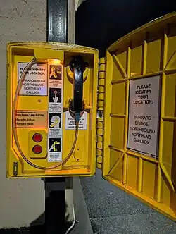 Since the early 1970s, the Toronto Transit Commission's (TTC) policy was to suppress information concerning suicide jumpers in the Toronto subway, however data were publicly released following a request from journalists in 2009.[64] As an interim measure, in June 2011, the TTC implemented a "Crisis Link" campaign, with posters exhorting persons contemplating suicide to press an autodial button on one of 141 designated payphones located on 69 stations' platforms to speak directly with a trained counsellor with the Distress Centres of Toronto.[65] Platform screen doors have already been built in underground mass transit systems in cities in Europe and Asia as a safety measure to stop people falling or jumping onto train tracks. The first screen doors in Canadian metro stations were scheduled for Toronto in 2013.