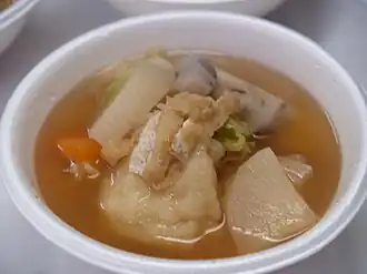Suiton has a long history, and its root "mizu-dango" can be seen in the Muromachi period.[2] It is also called "water dumpling".[3] The cooking method of suiton on the material has changed drastically, and the form of hand-cooked flour like today appears in the late Edo period.[4] From the Edo era to the prewar days, there were stalls and restaurants specializing in suiton, and it was popular food for ordinary people at that time. Although it had decreased considerably in the middle of the Taisho era, immediately after the Great Kanto Earthquake, stalls appeared everywhere in the burned fields as the food situation worsened.
