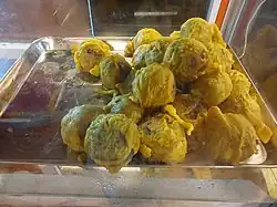 Sukiyan (or sukhiyan or sugiyan) is a fritter food made with pulses, jaggery and maida flour. Also called "Suguntalu", it is a popular food item in South Indian cuisines, and it is generally eaten as a breakfast, a side dish, or a snack.[1][2][3] The lentils (mung beans) and jaggery are cooked, ground to form the stuffing, formed into the size of a ping pong ball, to finally deep fry in coconut oil / any other oil. This snack is also often found in small tea shops in the towns and villages of Kerala and Tamil Nadu.