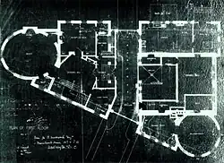 Just like the Perry Belmont House that was built a few years later, the Wadsworth House's design was made to fit an irregular-shaped lot.[9] The total cost of constructing the house was around $300,000.[10] The couple had their new home designed to specifically serve as a place of entertainment and socializing. This included a two-story ballroom, a musician's gallery, a porte-cochère similar to the one across the street at the William J. Boardman House, and a new feature in the city, an automobile room that served as an internal parking garage.[3] It is believed the porte-cochère, vestibule, servants hall, kitchen, back hallway, and automobile room incorporated the former church building.[1]