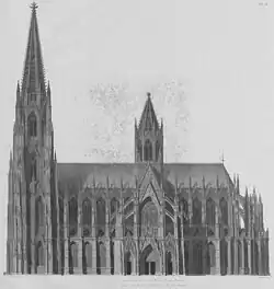 Boisserée spent much of his time campaigning for the restoration and completion of Cologne Cathedral, where construction had come to a halt during the Reformation.[2][4] Soon after settling in Heidelberg in 1810[1] he commissioned a survey of the building, and a set of drawings which were eventually published as engravings. Following the end of the Napoleonic wars, he managed to acquire, separately, the two halves of an enormous late 13th-century drawing, showing the original design for the west end, including the unbuilt north-west tower and west gable, and whole of the south-west tower, which had been only partially constructed .[4][5] He was able to interest Crown Prince Frederick William of Prussia (later King Frederick William IV) in the project, and in 1817 the prince commissioned a report from the architect Karl Friedrich Schinkel.[1] Work on the cathedral was eventually resumed in 1842,[1] and the building was completed towards the end of the 19th century.[2]