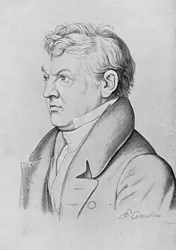 Boisserée was born in Cologne on 2 August 1783,[1] into a wealthy family having their origins in what is now Huy, Belgium from where they migrated to Cologne in the 18th century. After his mother and father died in 1790 and 1792, Boisserée was raised by his grandmother during the Napoleonic occupation of Cologne. He was expected to continue the family business while his younger brother, Melchior, was expected to become a scientist. In 1799, at the age of 16, Boisserée attended school in Hamburg, where he discovered his interest in art. After he returned to Cologne, Boisserée, his friend Johann Baptist Bertram and his brother Melchior began to systematically collect and save medieval paintings from the secularization processes at that time, initially with a focus on paintings of German and Dutch origins.[2] In 1803, the brothers went to Paris, where they studied the works on show at the Musée Napoleon at the Louvre, which had been greatly enriched through Napoleon’s looting of art from abroad.[2] In Paris they became disciples of the romantic theorist Friedrich Schlegel[3] with whom they visited Belgium and Switzerland in 1804-5.[2]