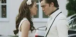 Gossip Girl costume designer, Eric Daman originally intended to dress Blake Lively in a men's vest but instead dressed her in an iconic Grecian gown coupled with a metallic chain headpiece after conflicts regarding the appearance of the vest when viewed via camera occurred.[5] For the scene at a garden dinner party, Daman fitted Ed Westwick with a light green suit with hydrangea and cabbage rose tones in his shirt and tie selection. Daman considered the experience as "[a] perfect moment of art direction — he actually matched the set, and when he and Blair have their sad moment in the garden, it was a symphony of greens and flower blossoms. A memorable moment where costumes and sets work seamlessly to create a visual atmosphere."[6] During a New York Magazine interview, Eric Daman cites both outfits in his list of eleven favorite looks in the series.[7]