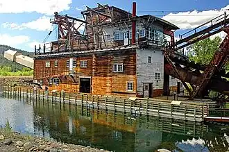 Three dredges worked the valley from 1913 to 1954. Sumpter No. 3 was built substantially from parts of the first dredge, which had been idle for 10 years. Between them, the dredges traveled more than 8 miles (13 km),[4] extracting $10 to 12 million worth of gold. Still, it cost more to run than the gold could pay for. The last dredge closed in 1954, more than $100,000 (~$900,368 in 2023) in debt. In its lifetime this dredge made $4.5 million at $35 per troy ounce. That is 128,570 troy ounces which, at the recent value of $1,990.00 per ounce, would be worth $255,854,300.[5][6]