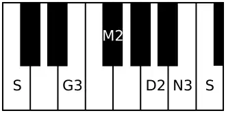 | Avarohanam | Ṡ N₃ D₂ M₂ G₃ S |