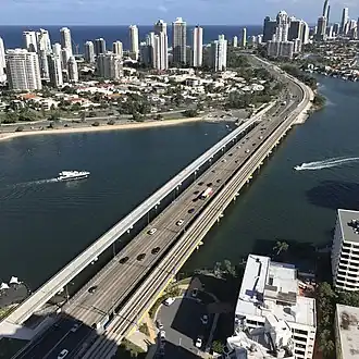 The Sundale Bridge is a bridge located in the Gold Coast region of South East, Queensland, Australia. Officially known as the Gold Coast Bridge, but locally referred to as the Sundale Bridge due to its proximity to the site of the former Sundale Shopping Centre, and now Sundale Apartments[2] the bridge spans the Nerang River linking the suburbs of Southport and Main Beach. Opened initially in 1966, the bridge replaced the Jubilee Bridge, and comprises four separate decks and pier structures built at various stages and for a variety of purposes.