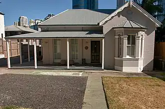 Sunnyside is a substantial, single-storeyed masonry residence located in Main Street, Kangaroo Point, on a sloping block overlooking the Brisbane River and the Brisbane central business district. While the property does not extend to the riverbank, the house behind is at a much lower level and the land on the river bank below is now part of a Brisbane City Council-owned public park, hence the views of the city have not been built out. Immediately adjacent to Sunnyside on the south boundary is the heritage-listed Silverwells.[1]