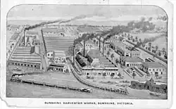 Through a revolutionary piece of marketing, this had gained a reputation as the first successful combine harvester in Australia. The factory became the largest in the Southern Hemisphere, and, in its early stages, McKay successfully increased the concentration and efficiency of the workers: ‘between 1907 and 1910-11, McKay’s workforce expanded from just over 400 to around 1500’.[3] McKay rapidly expanded the factory to become the largest manufacturing plant in Australia and, at its peak, it employed nearly 3,000 workers. In 1907, following a residents' petition, the locality was officially renamed Sunshine in honour of the factory.[4] Housing for the Sunshine Harvester Works' employees swelled the local population and the town of Sunshine was touted as the "Birmingham of Australia".[5]
