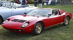 The Lamborghini Miura, introduced in 1966 by the Italian manufacturer, is often said to be the first supercar.[2][3][4][5] By the 1970s and 1980s, the term was in regular use for such a car, if not precisely defined.[6][7] One interpretation up until the 1990s was to use it for mid-engine two-seat cars with at least eight cylinders (but typically a V12 engine), a power output of at least 400 bhp (298 kW) and a top speed of at least 180 mph (290 km/h).[1] Other interpretations state that "it must be very fast, with sporting handling to match", "it should be sleek and eye-catching" and its price should be "one in a rarefied atmosphere of its own";[8] exclusivity – in terms of limited production volumes, such as those of the most elite models made by Ferrari or Lamborghini – is also an essential characteristic for some using the term.[5] Some European manufacturers, such as McLaren, Pagani, and Koenigsegg, specialize in only producing supercars.[9][10][11][12][13]