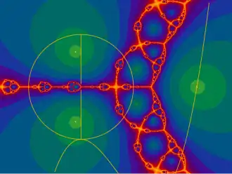 Newton's method for p(z) = z3 − 2z2 − 1:ς (right) and its complex conjugates at the nuclei of their basins of attraction. Julia set of the Newton map in orange, with unit circle and real curve for reference.