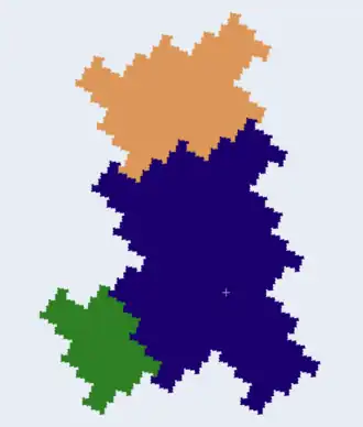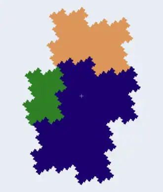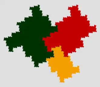 Associated to this string rewriting process is a compact set composed of self-similar tiles called the Rauzy fractal, that visualizes the combinatorial information contained in a multiple-generation three-letter sequence.[13]