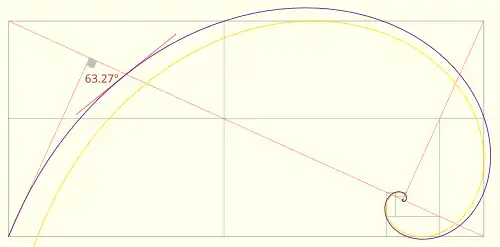 A supersilver spiral is a logarithmic spiral that gets wider by a factor of for every quarter turn. It is described by the polar equation with initial radius and parameter If drawn on a supersilver rectangle, the spiral has its pole at the foot of altitude of a triangle on the diagonal and passes through vertices of rectangles with aspect ratio which are perpendicularly aligned and successively scaled by a factor