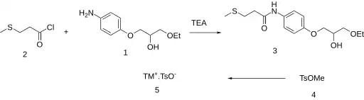 Acylation of 1-(4-aminophenoxy)-3-ethoxypropan-2-ol (1) with 3-methylthiopropionyl chloride (2) gives the amide (3). Methylation of the thioether using methyl tosylate (4) yields suplatast as its toluenesulfonic acid salt.[6][7][8]