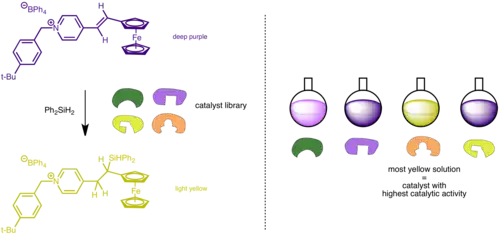 A problem with transition state analogue selection approach is that catalytic activity is not a screening criterion. TSAs do not necessarily represent real transition states and so a catalyst obtained from screening could just be the best receptor for a TSA but is not necessarily the best catalyst. To circumvent this problem, catalytic activity needs to be measured directly and also quickly. To develop a high-throughput screen, substrates could be designed to change color or release a fluorescent product upon reaction. For example, Crabtree and coworkers utilized this method in screening for a hydrosylation catalysts for alkene and imine.[22] Unfortunately the prerequisite for such substrates narrow down the range of reactions for study.[19]
