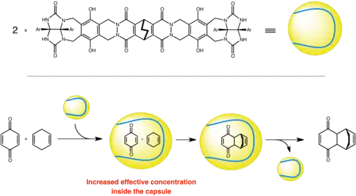 - ^ a b Rebek, J. Jr; Kang, J. (1997). "Acceleration of a Diels–Alder Reaction by a Self-Assembled Molecular Capsule". Nature. 385 (661): 50–52. Bibcode:1997Natur.385...50K. doi:10.1038/385050a0. PMID 8985245. S2CID 4361080.
